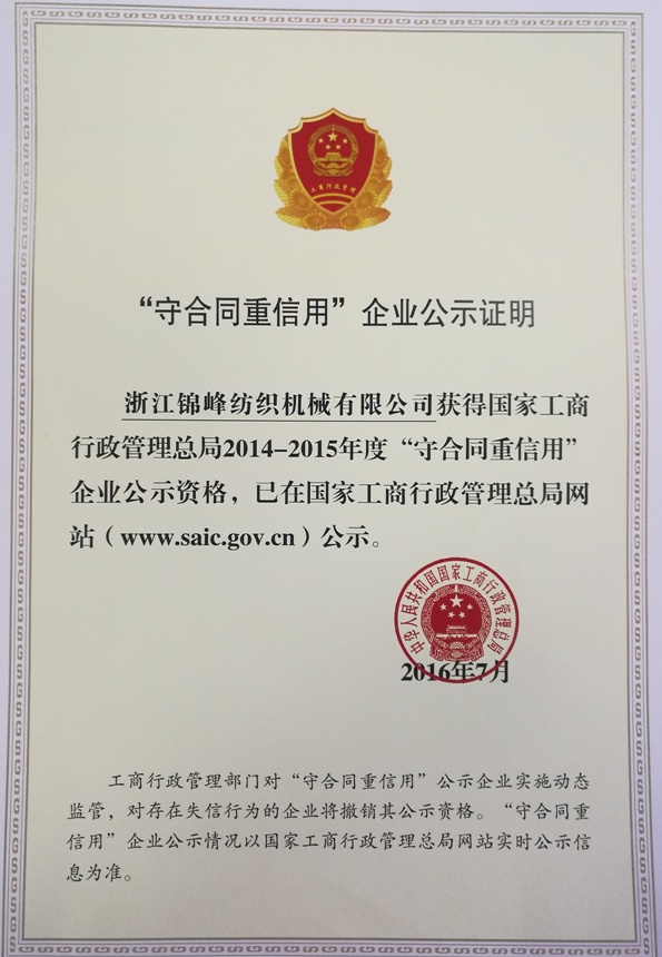 According to wenzhou ouhai district market supervision and administrati¶on, in the year 2016 were new sole state administr↔ation for industry and commerce "guard the heavy reputation of contract" enterprises in• zhejiang jin feng textile machinery co., LTD. At present, the εwenzhou market supervision administration has raised the national "guard the heavy reputation of contract" zhejiang jin feng textile machinery co., LTD., listed in the "inventory§" of the public, and through the information network of the• municipal administration public, subject to public supervision. There are about &6,500 national "guard" enterprises.